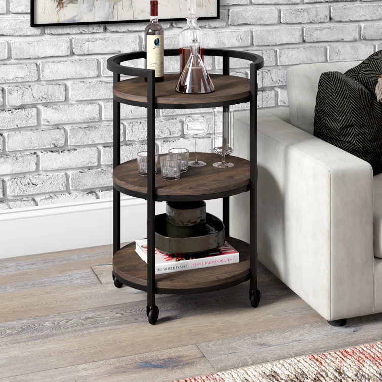 Combine functionality and on-trend design with this eye-catching modern bar cart. Its round wood-finish MDF shelves are offset by the clean lines of the steel-blackened bronze frame.