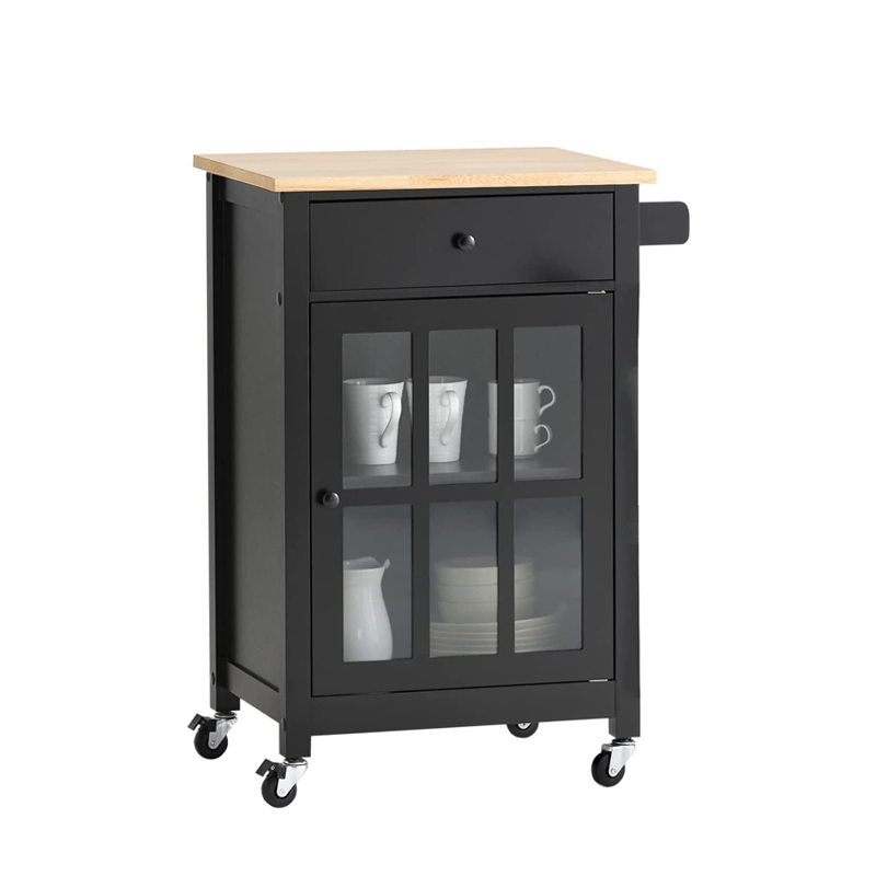 This gorgeous 2 tiered kitchen cart with exquisite crisscross design and see through glass cabinet door will add a sense of sophistication into your kitchen.