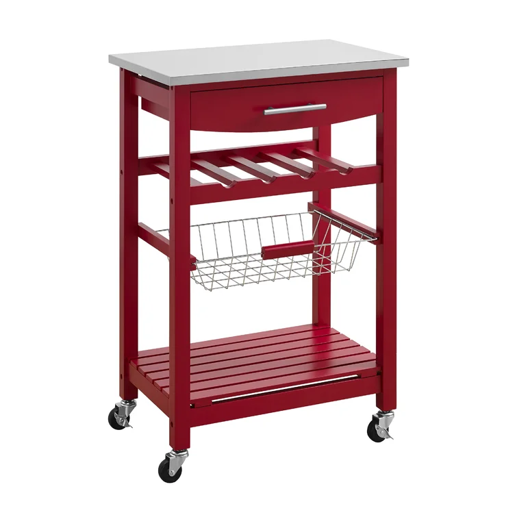 Expand your kitchen workspace with this kitchen cart with a stainless steel top. A single storage drawer, wire basket, wine bottle storage rack, and a single shelf, provide ample storage space for all of your kitchen essentials.